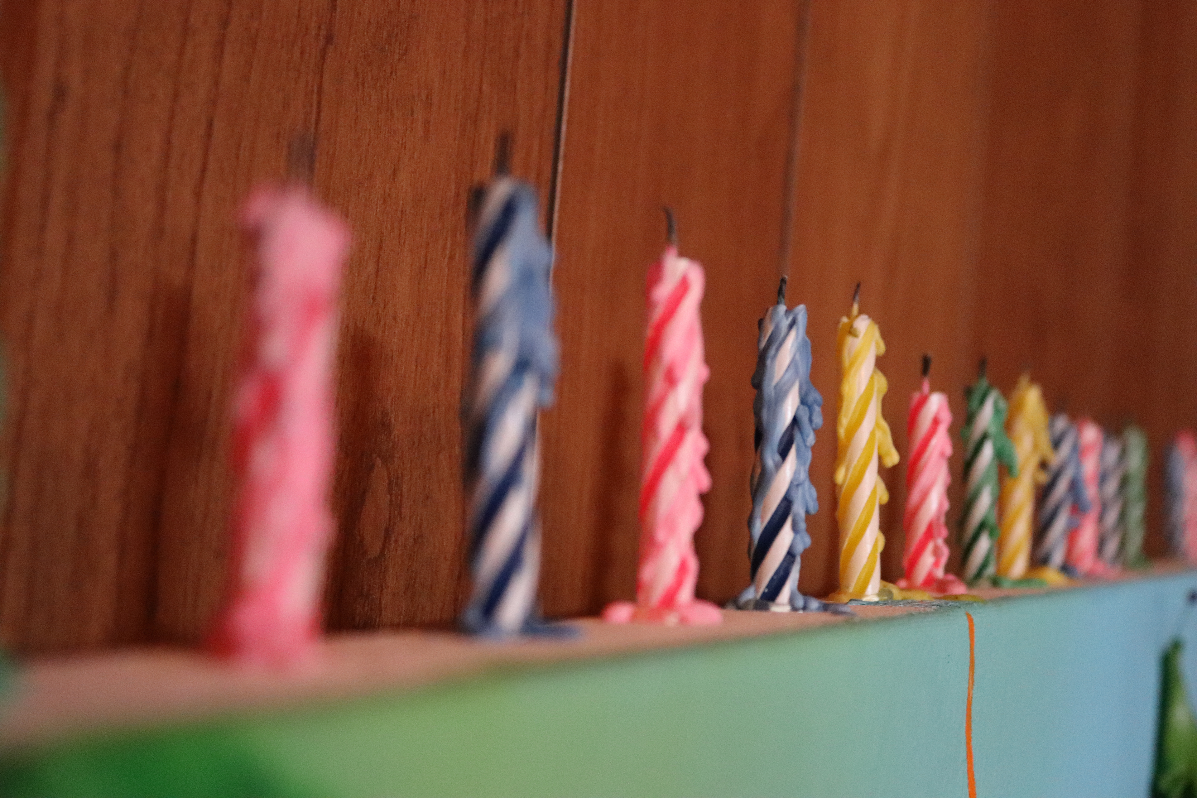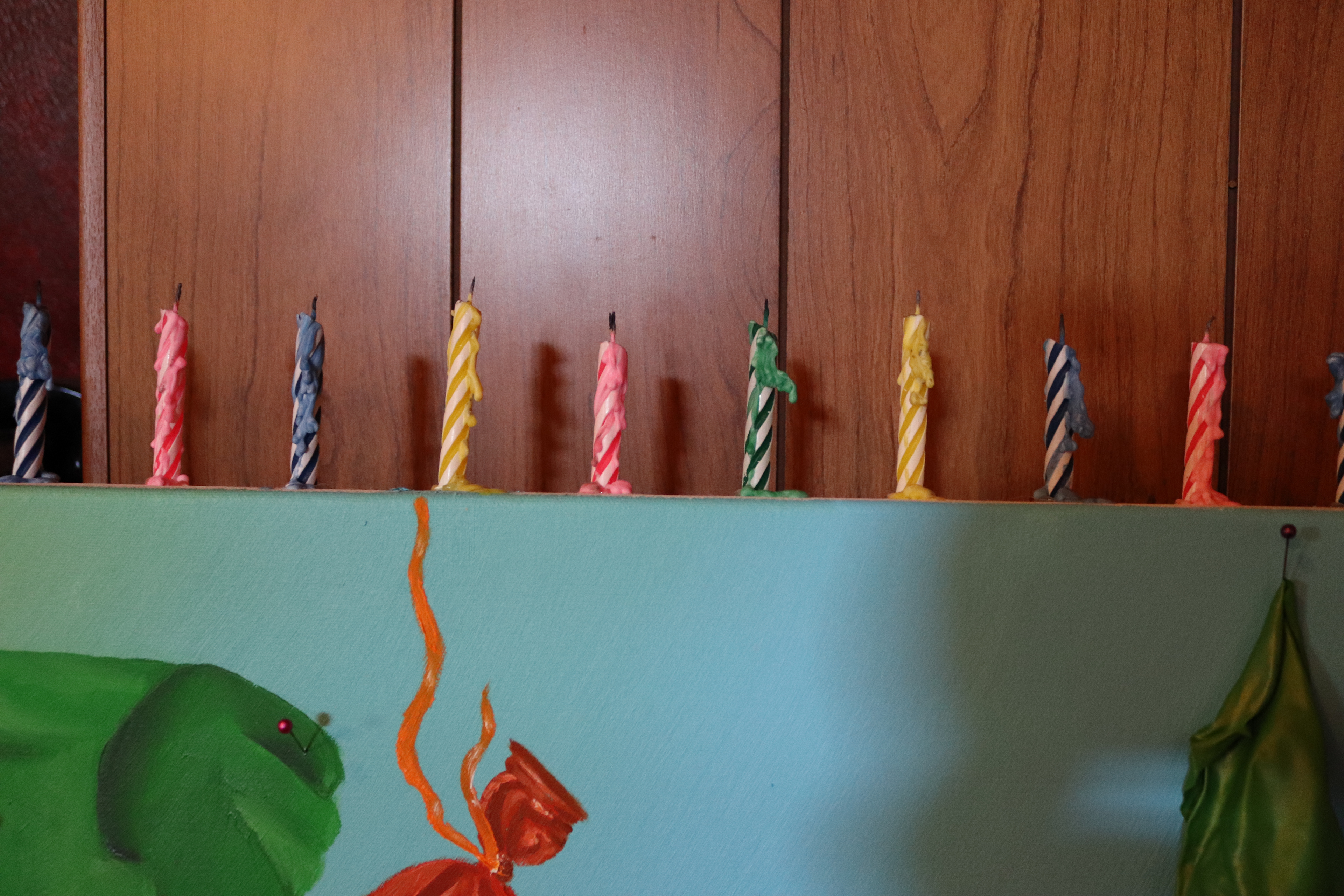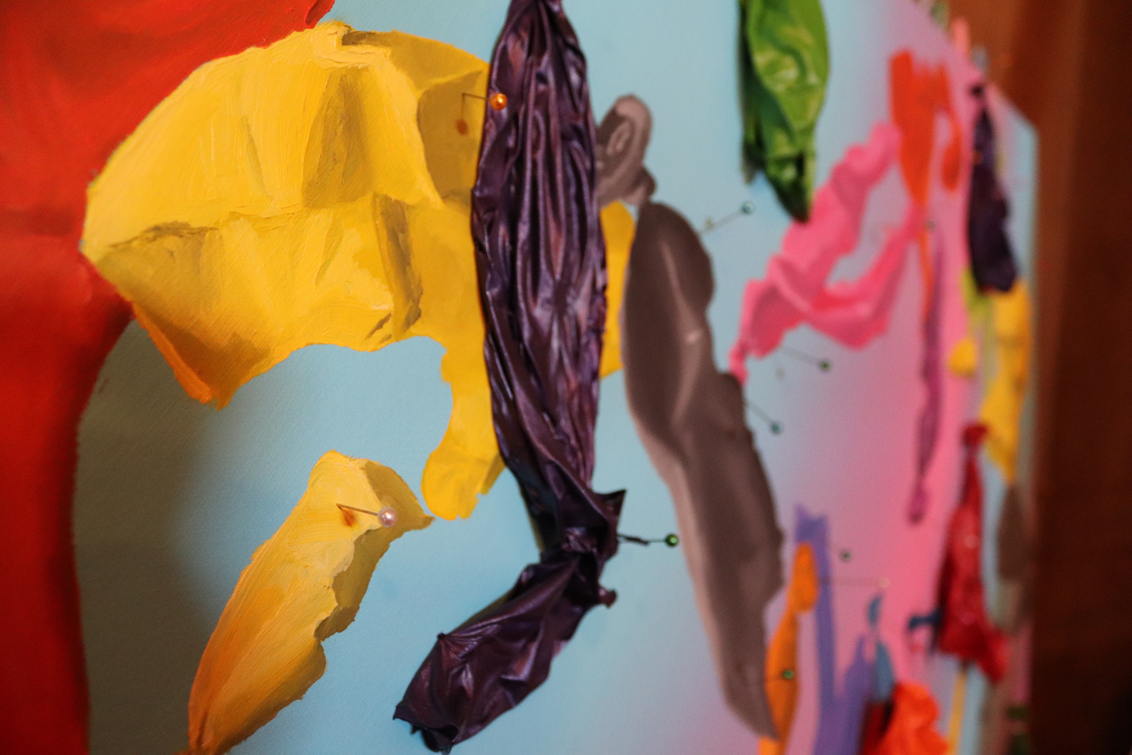 “Fragapane Phobia” is a 40-inch by 30-inch oil on canvas painting with pins, balloons and candles attached. I paint popped balloons on top of a green, blue, and pink gradient. Throughout the image I impale the balloons with colorful metal pins, some of which are holding up real popped balloons hanging aside the painted ones. On top of the painting, I have 23 birthday candles with 22 of them having been melted as, at the time, I had celebrated 22 birthdays. A birthday is usually thought of as a bright time in our lives and a celebration. However, if someone struggles with the idea of life in general, the birthdays become a record of the days that we have lived rather than a means to look toward the future. Each one that we experience becomes further masked in uncertainty for the future. At times it becomes difficult to predict whether we are going to make it to our next one, and for some who plan out their deaths, it can be an out of body experience when they make it to a birthday that they did not think they would have. This depiction of a celebration that has ended is deeply evocative of the many lives that have been lost due to the mental health crisis we are experiencing in America. It is painful to know that each day, someone new becomes a victim of their own mind. My hope is that this painting solidifies the necessity that when someone says they need help, that we each reach out a hand and offer that help.