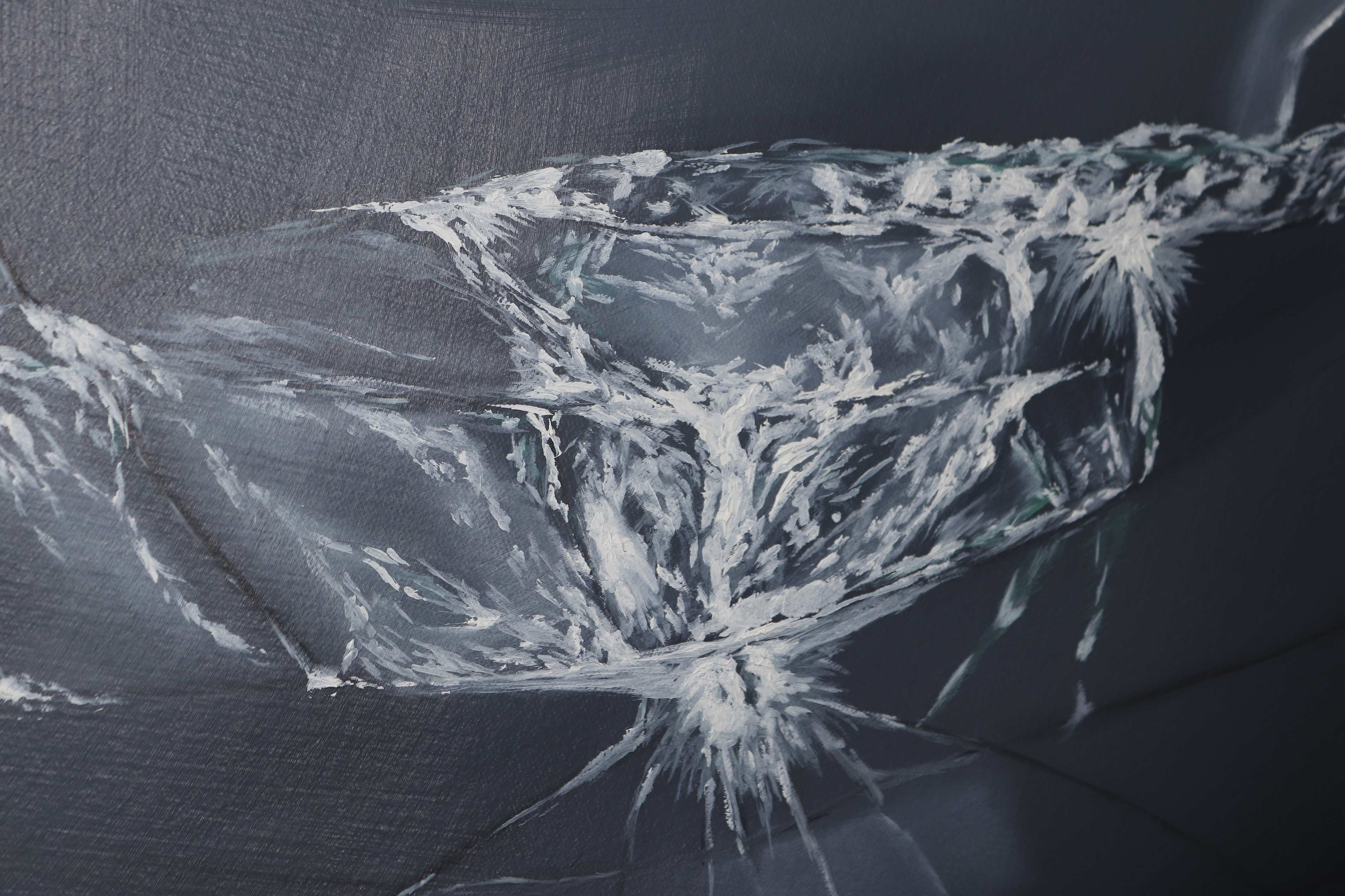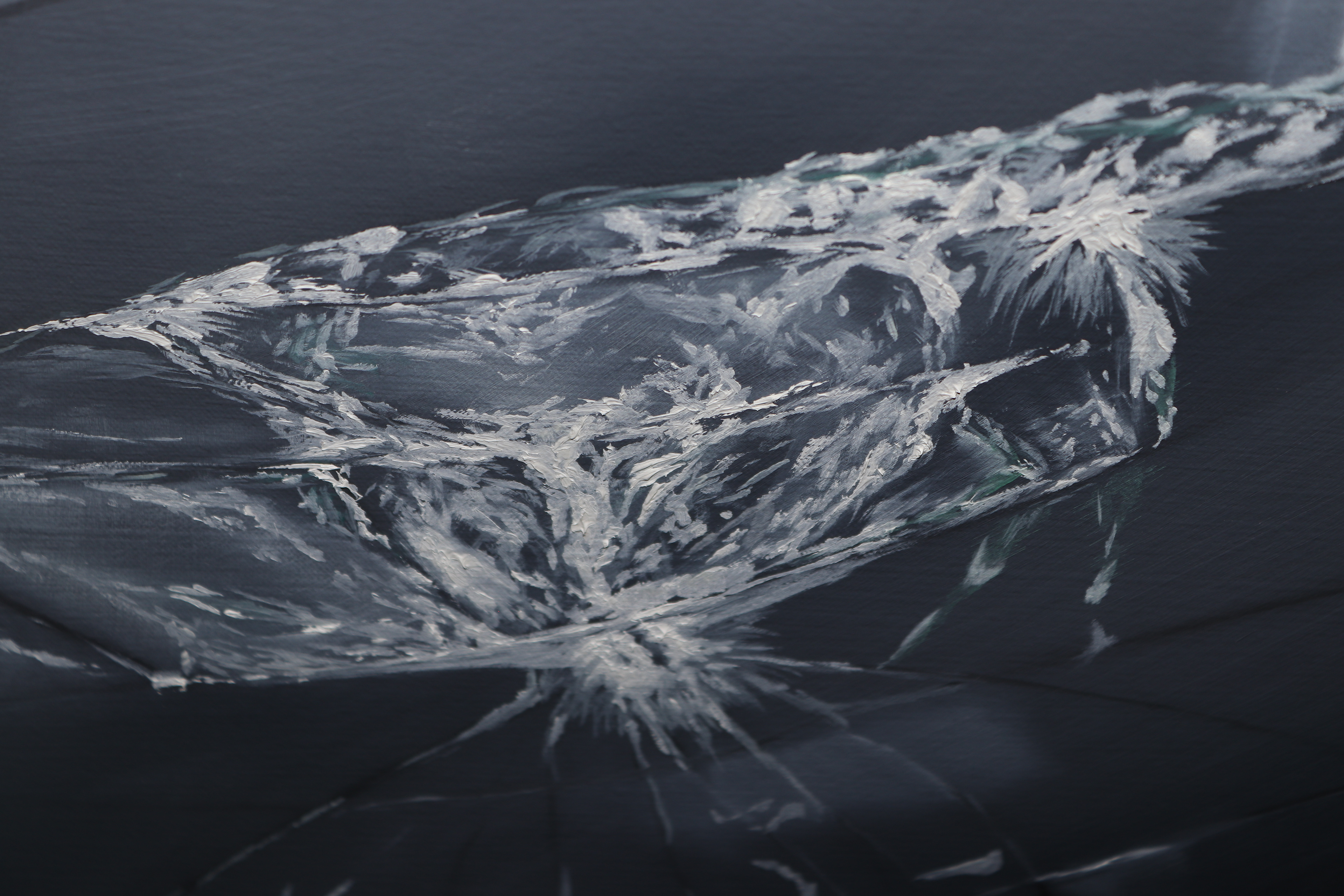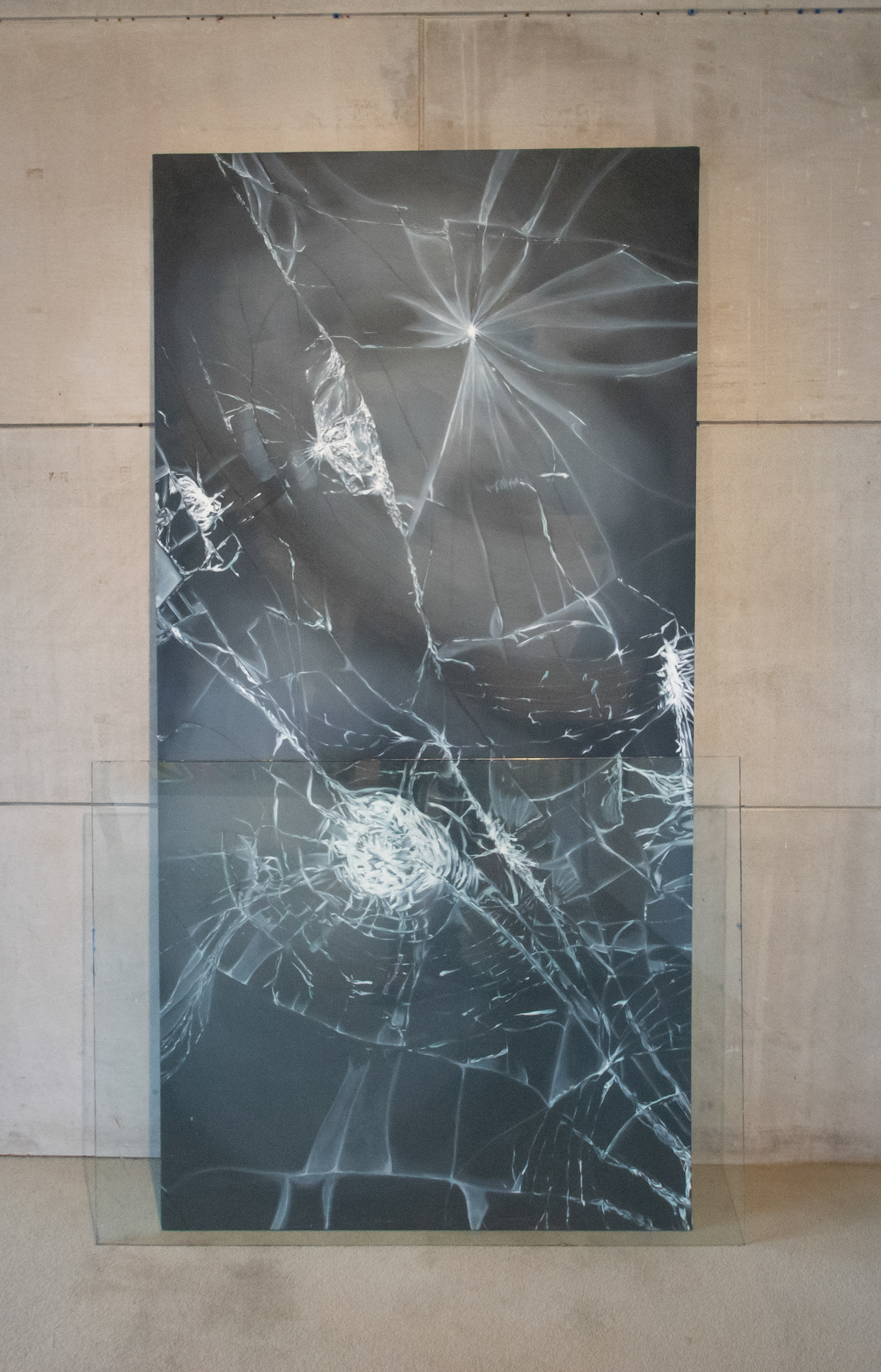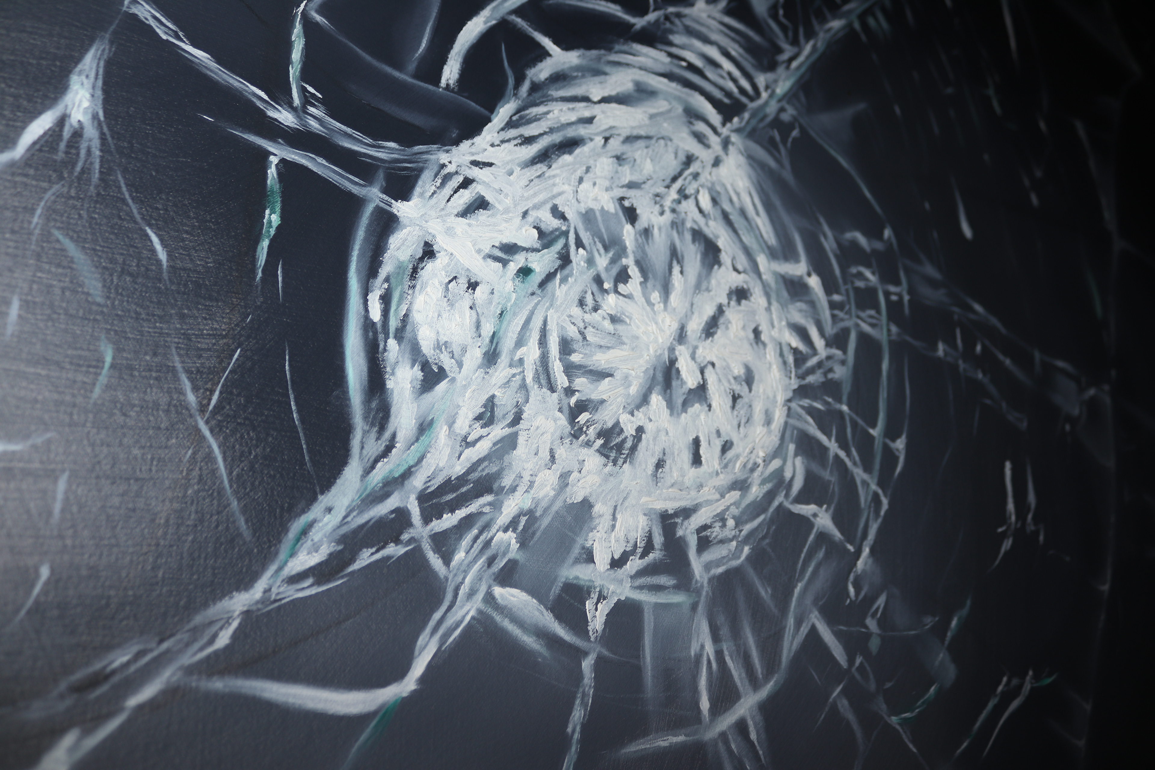 “Katarreophobia” is a 40-inch by 80-inch oil on canvas painting with a glass palette leaning against it. Katarreophobia is the fear of falling apart. Falling apart physically, mentally and emotionally. The fear that a moment of vulnerability could cause me to spiral. I regularly deal with both anxiety and depression. These two contrasting things could easily feed one another, and a single moment is enough to cause me to break. This painting is displayed sitting on the ground leaning against the wall to make the painting vulnerable to possible dangers. The only protection given to it is a glass palette, the same one I used while painting. This represents a response to the fear. I was afraid of patrons coming through and possibly damaging the painting while exhibited. I decided to put this glass in front as a small barrier to protect the vulnerable painting. Much like we put up walls in our persona to keep others at a distance so that we do not spiral to a breaking point. The glass, reflecting the viewer back at them, creates an illusion for the viewer where you may see the “broken glass” through the clarity and reflectiveness of glass while allowing the upper part to show the detail of my work.